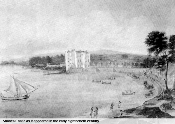 An account of the rebellion in Ulster states that in 1596, “on the edge of Lough Neagh standeth a runiated pile called Edendow Carreck, which, being made wardable, could be converted into a store for provisioning Blackwater and Coleraine in case of sea storms.” This Castle changed hands repeatedly, and, finally, in 1607, James I settled the Castle and Estate upon Shane McBrian O’Neill, whose family had held it at various times previously. The name “Shane’s Castle" is probably derived from this man.